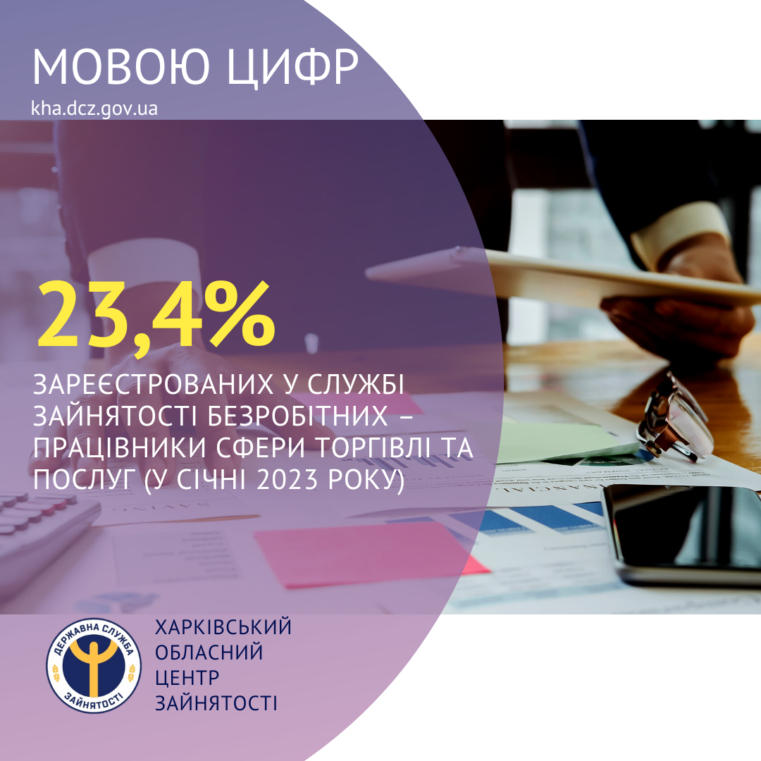 23,4% зареєстрованих у Харківській обласній службі зайнятості безробітних – працівники сфери торгівлі та послуг (у січні 2023 року).