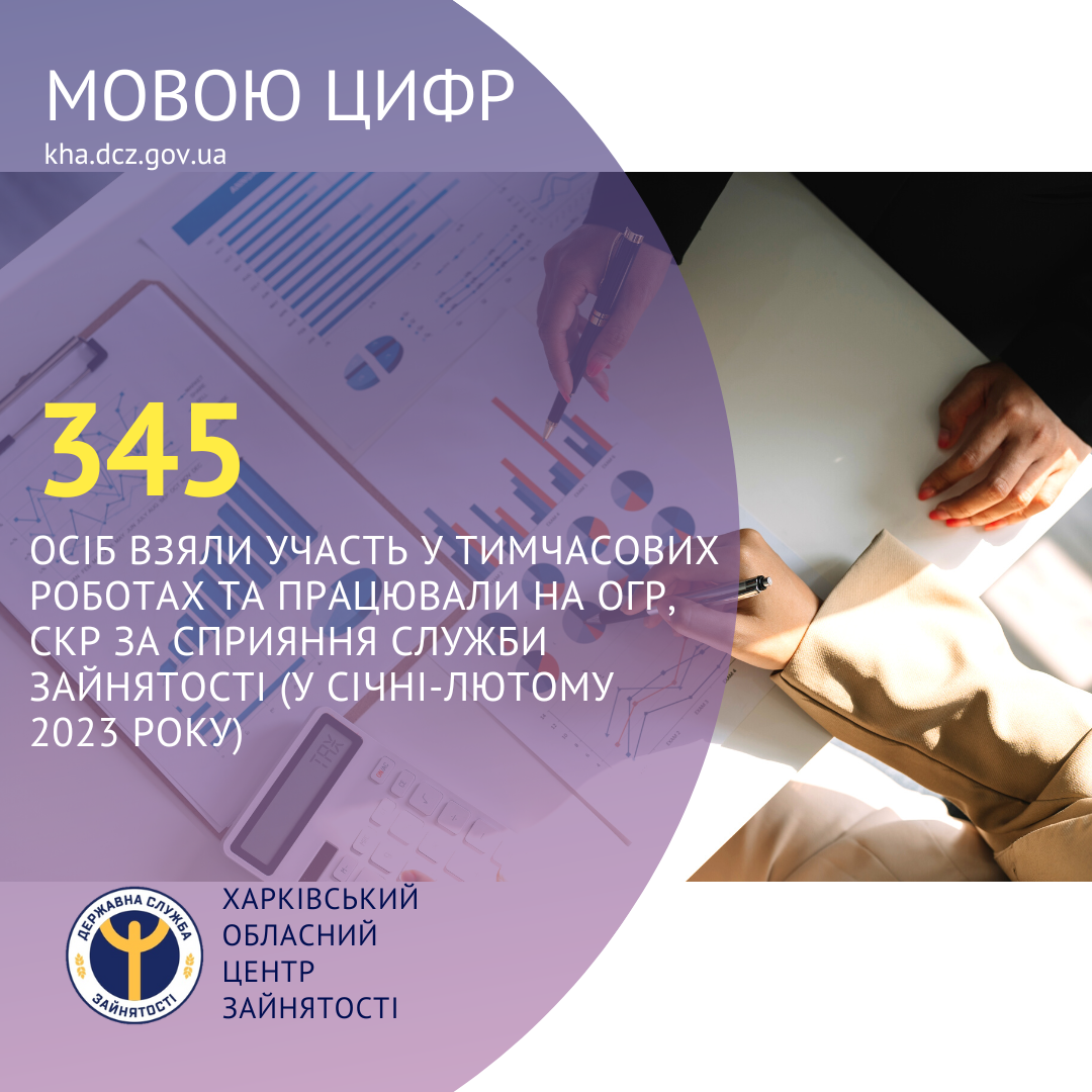 345 осіб взяли участь у тимчасових, оплачуваних громадських та суспільно корисних роботах за сприяння Харківської обласної служби зайнятості (у січні-лютому 2023 року).