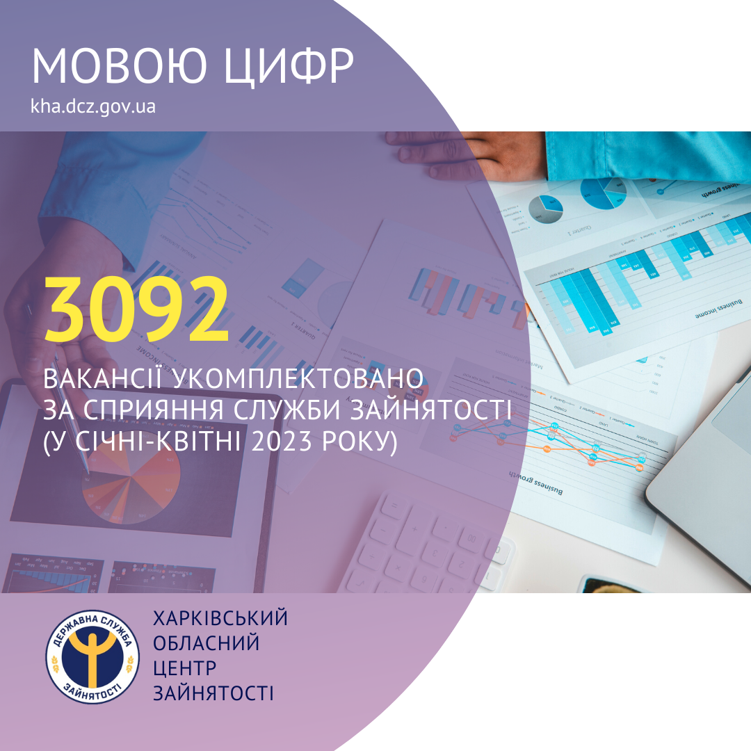 3092 вакансії укомплектовано за сприяння Харківської обласної служби зайнятості (у січні-квітні 2023 року).