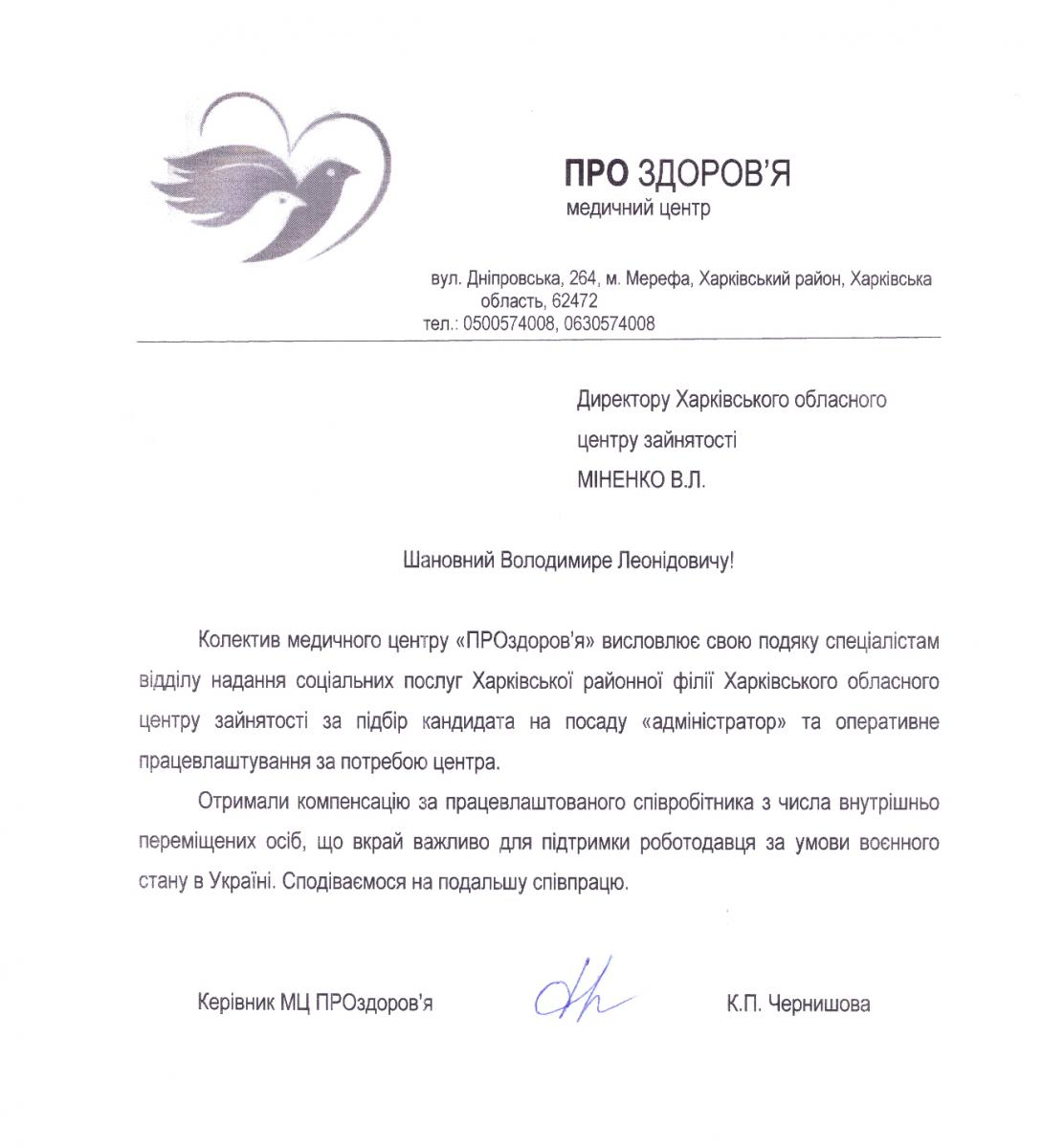 На ім'я директора Харківської обласної служби зайнятості Володимира Міненка надійшла подяка від Медичного центру «ПРОздоров’я» за підбір кандидата на посаду адміністратора фахівцями Харківської районної філії Харківського обласного центру зайнятості.
