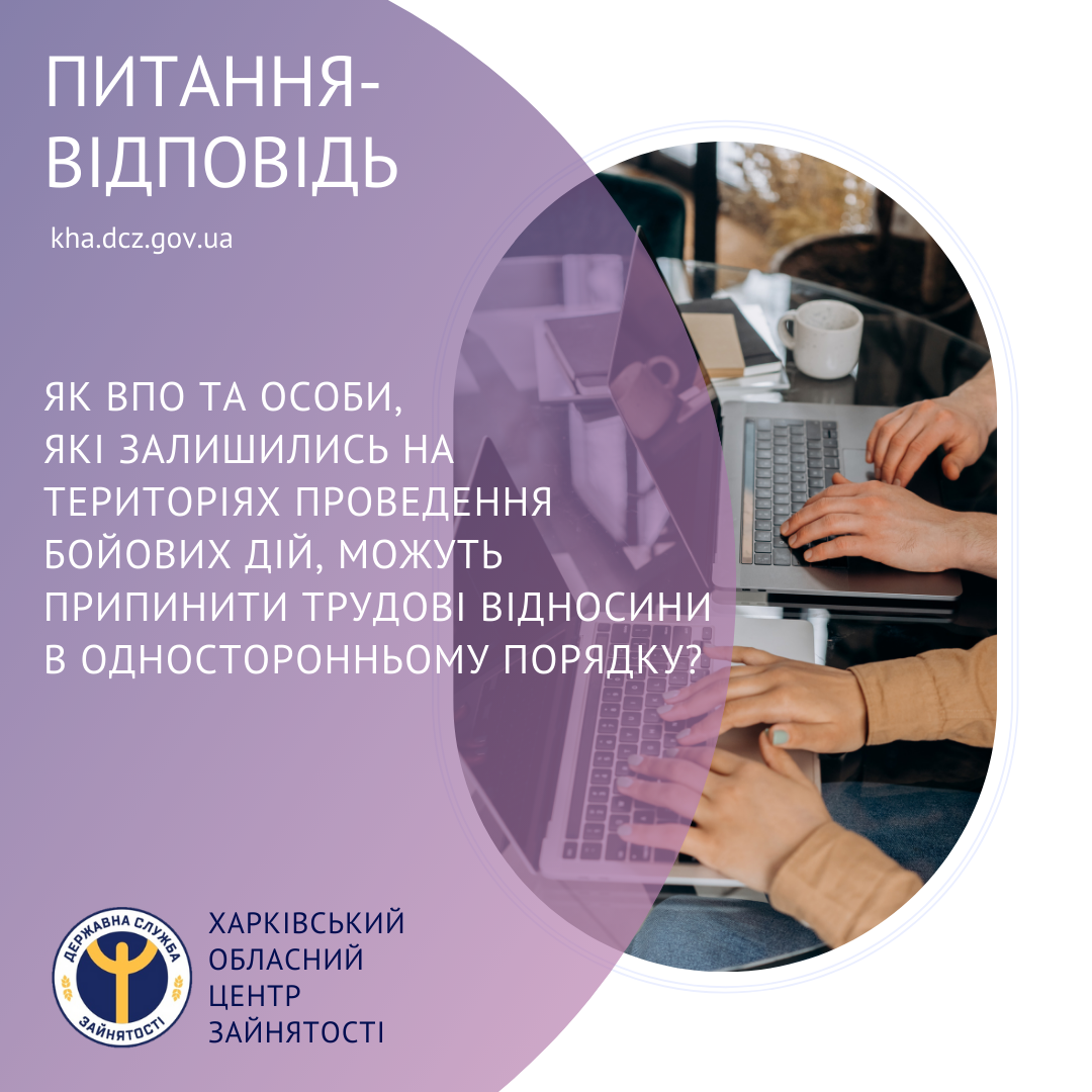 Для отримання статусу безробітного громадянам, які є ВПО та особами, які залишились на територіях проведення бойових дій, передбачено можливість припинити трудовий договір (інший вид діяльності) в односторонньому порядку, подавши до центру зайнятості заяву на ім’я роботодавця про припинення трудового договору.