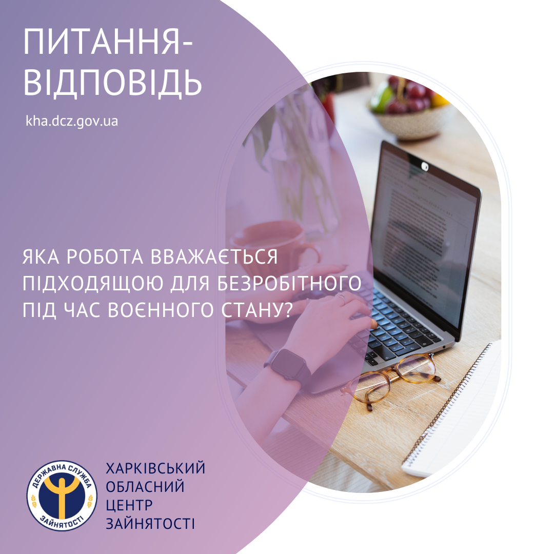 Згідно з ч. 5-2 розділу «Прикінцеві та перехідні положення» Закону України «Про зайнятість населення» (http://surl.li/cwkfw) під час дії воєнного стану підходящою для безробітного та особи, яка шукає роботу, вважається робота, яка: