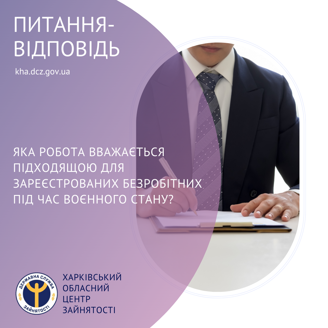Для осіб, які у період дії воєнного стану перебувають у статусі зареєстрованого безробітного понад 30 календарних днів, та для осіб, які не мають професії (спеціальності) і вперше шукають роботу, підходящою є робота, яка не потребує кваліфікації (спеціальності), професійної підготовки, або робота, що потребує первинної професійної підготовки, зокрема безпосередньо на робочому місці.