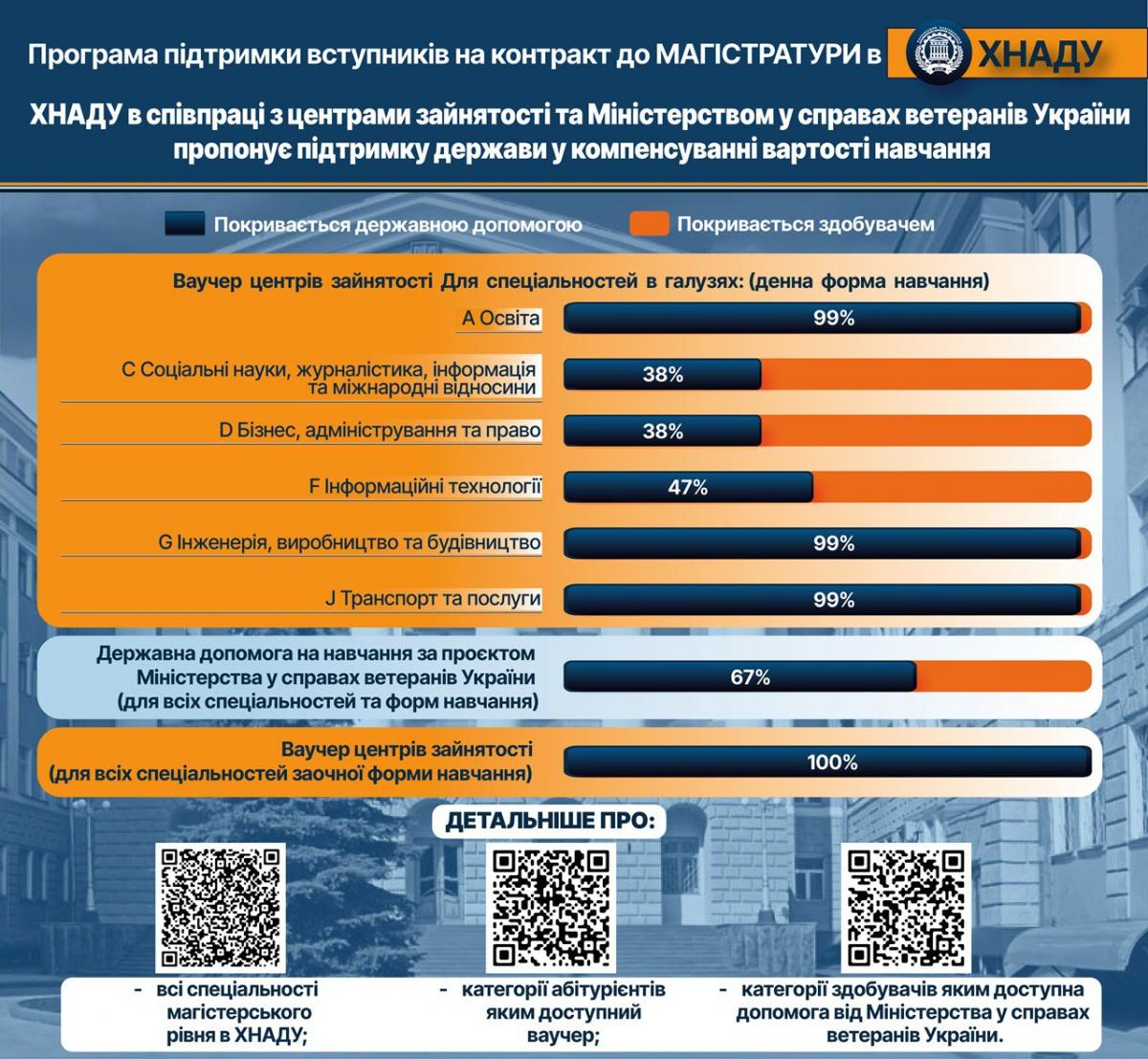 Частину або всю вартість навчання може бути компенсовано. ХНАДУ пропонує підтримку: компенсування вартості навчання, в співпраці з Державною службою зайнятості та Міністерством у справах ветеранів України! Не зволікай Зроби прості кроки і отримай бажану освіту вже цього року: Обирай спеціальність в магістратурі ХНАДУ. (24 різнопланові освітні програми);
