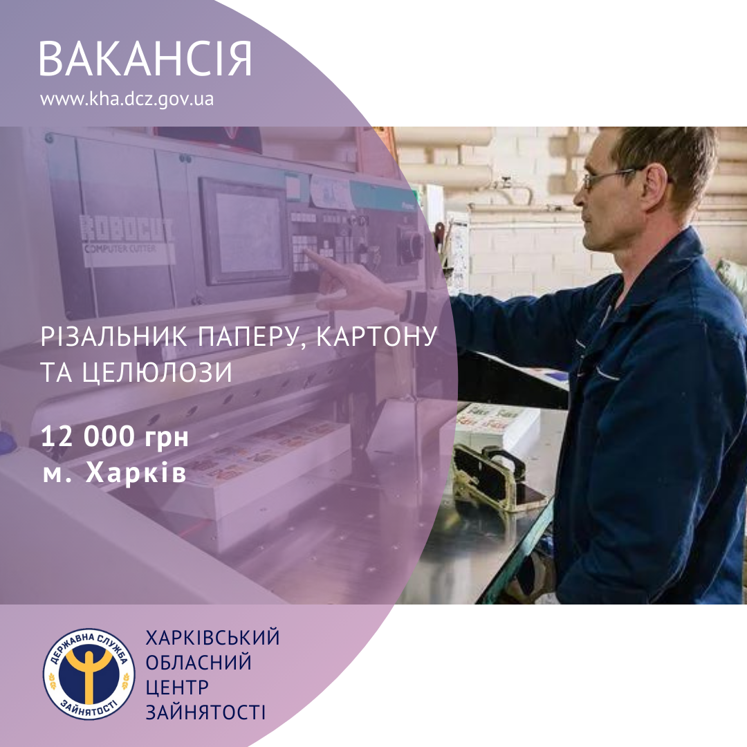 Завдання та обов’язки: подача сировини для виробництва картону, різання готової продукції за вказаними розмірами.